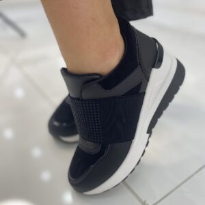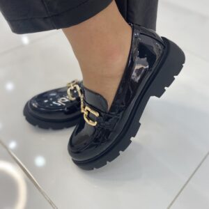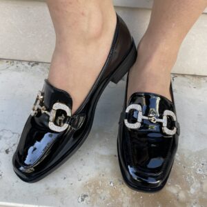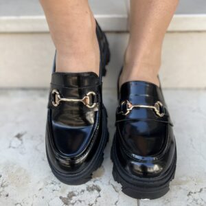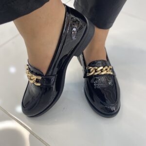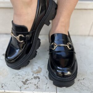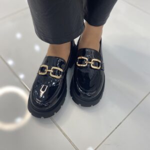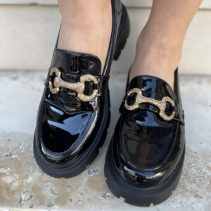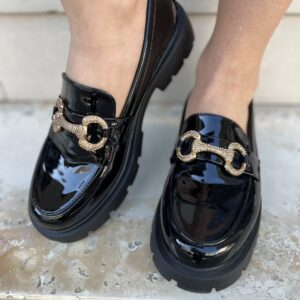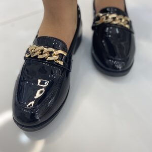 Original price was: 44.90€.29.90€Η τρέχουσα τιμή είναι: 29.90€.Μαύρα Loafers λουστρίν με Διακομητική Αλυσίδα