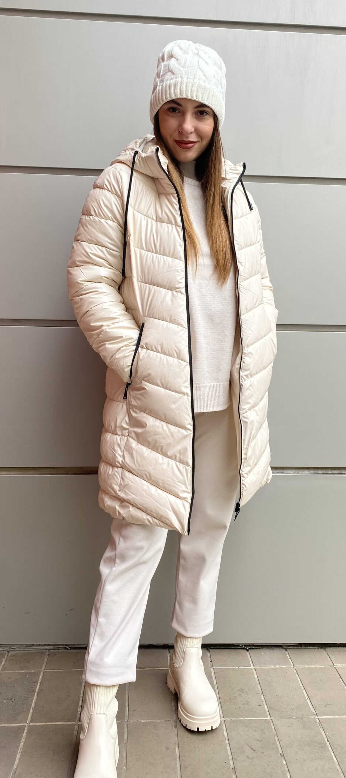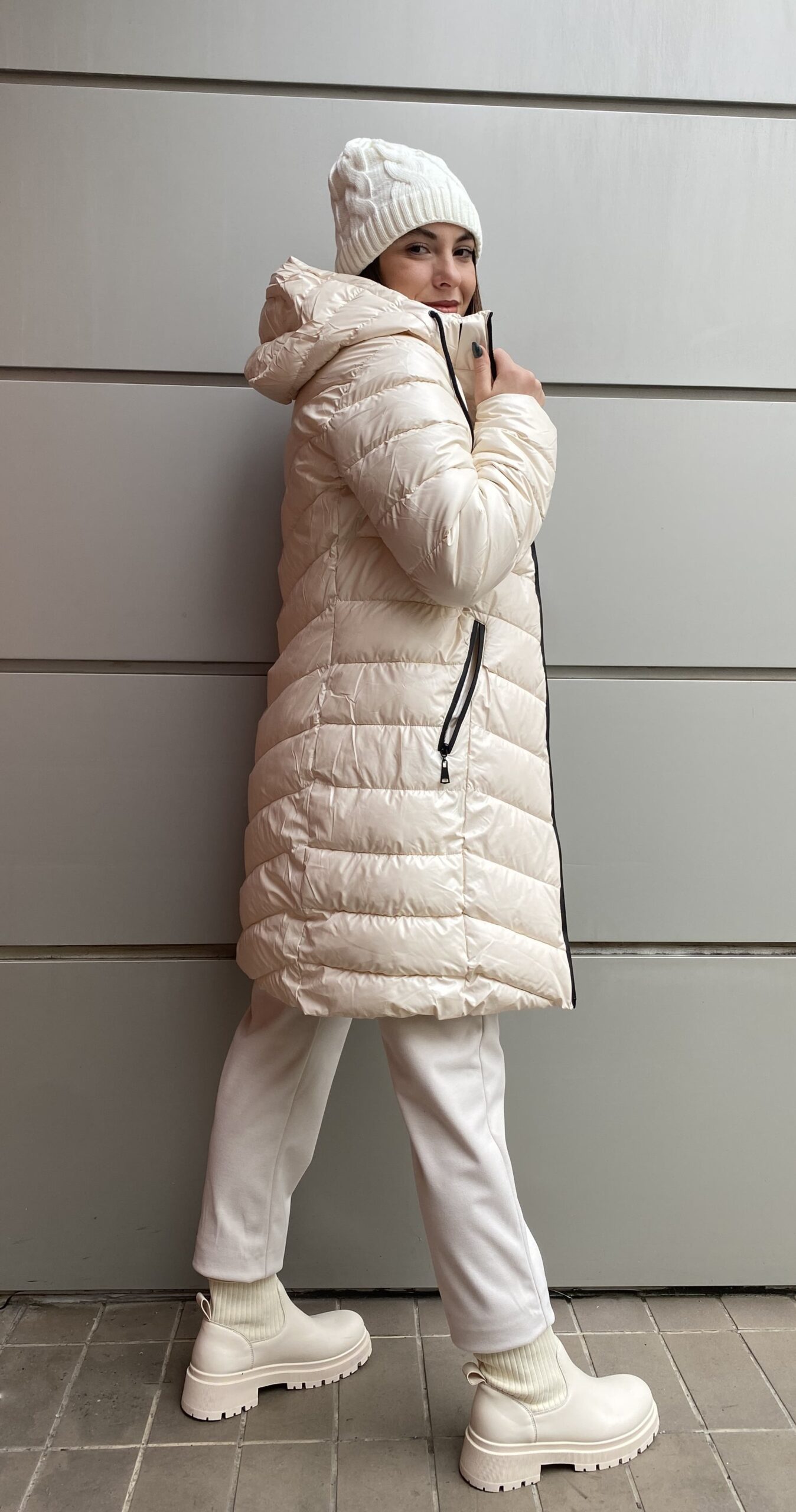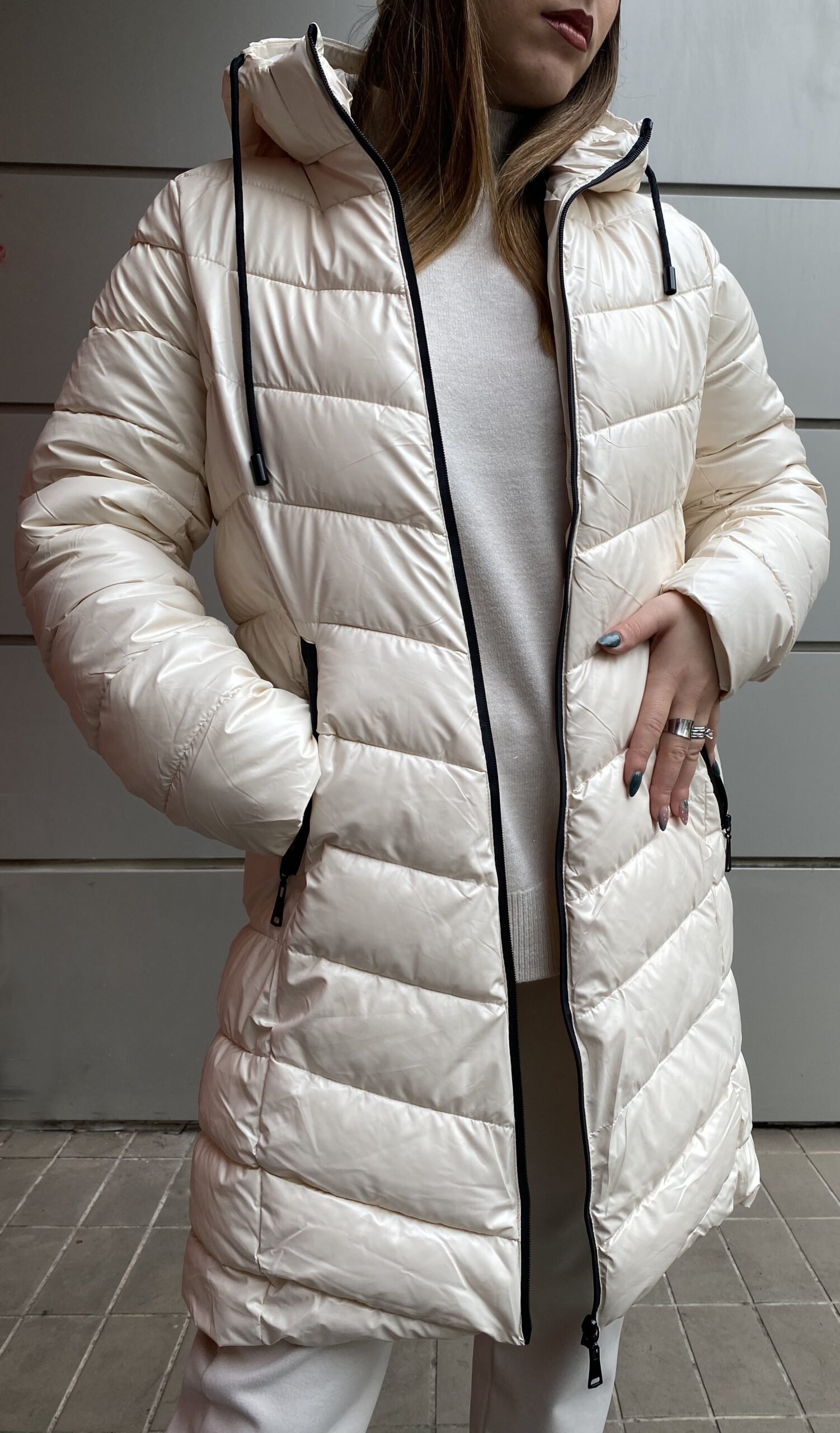 Γυναικείο μακρύ καπιτονέ μπουφάν σε λευκό χρώμα με μαύρες λεπτομέρειες. Είναι κατασκευασμένο από ανθεκτικό ύφασμα και ζεστό για τις κρύες μέρες.