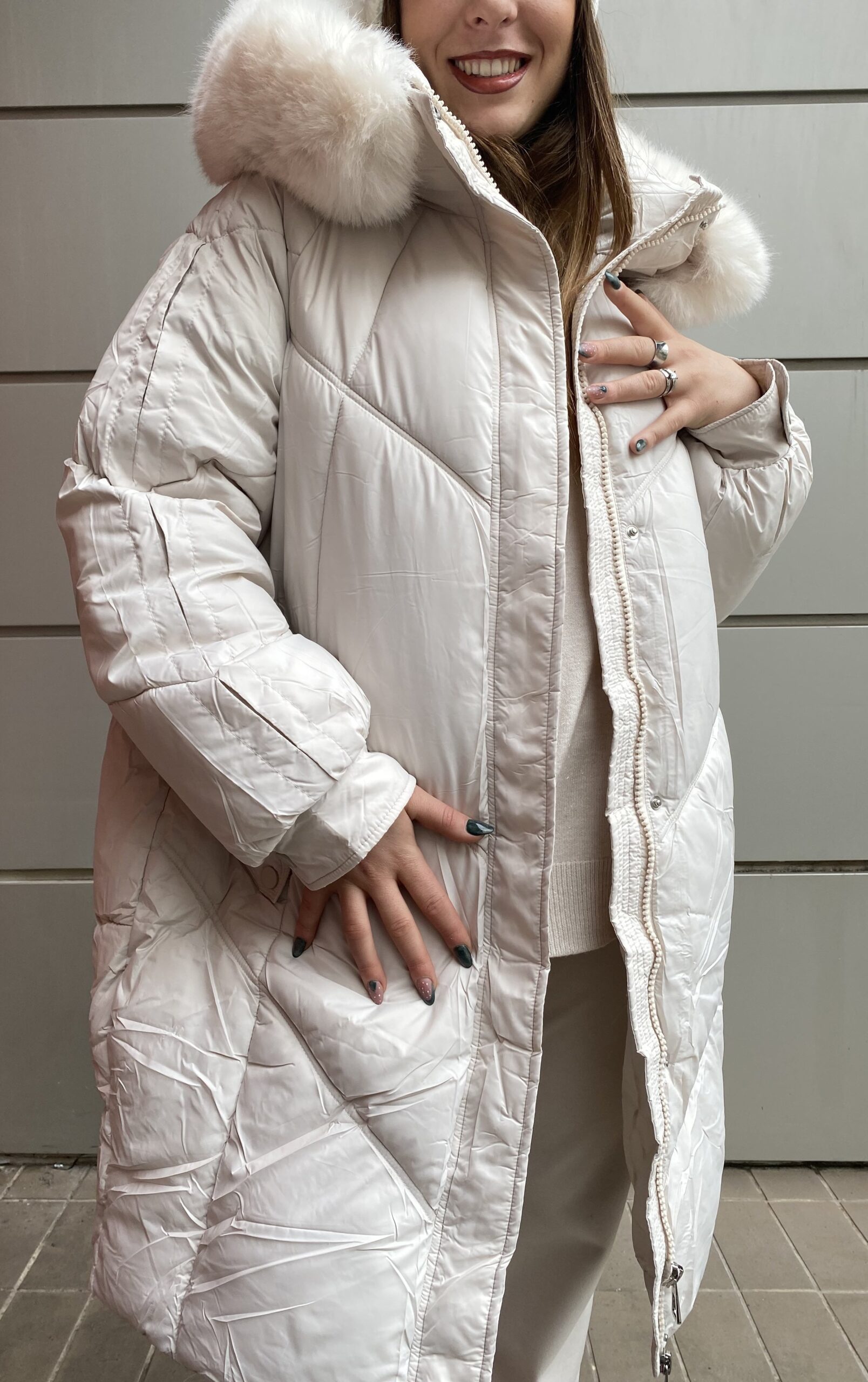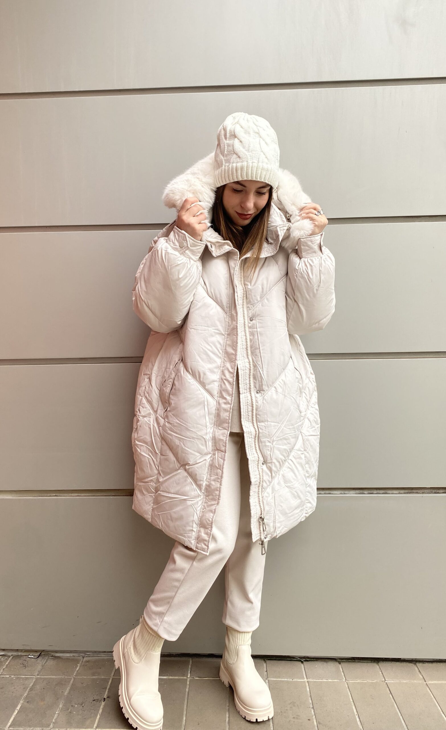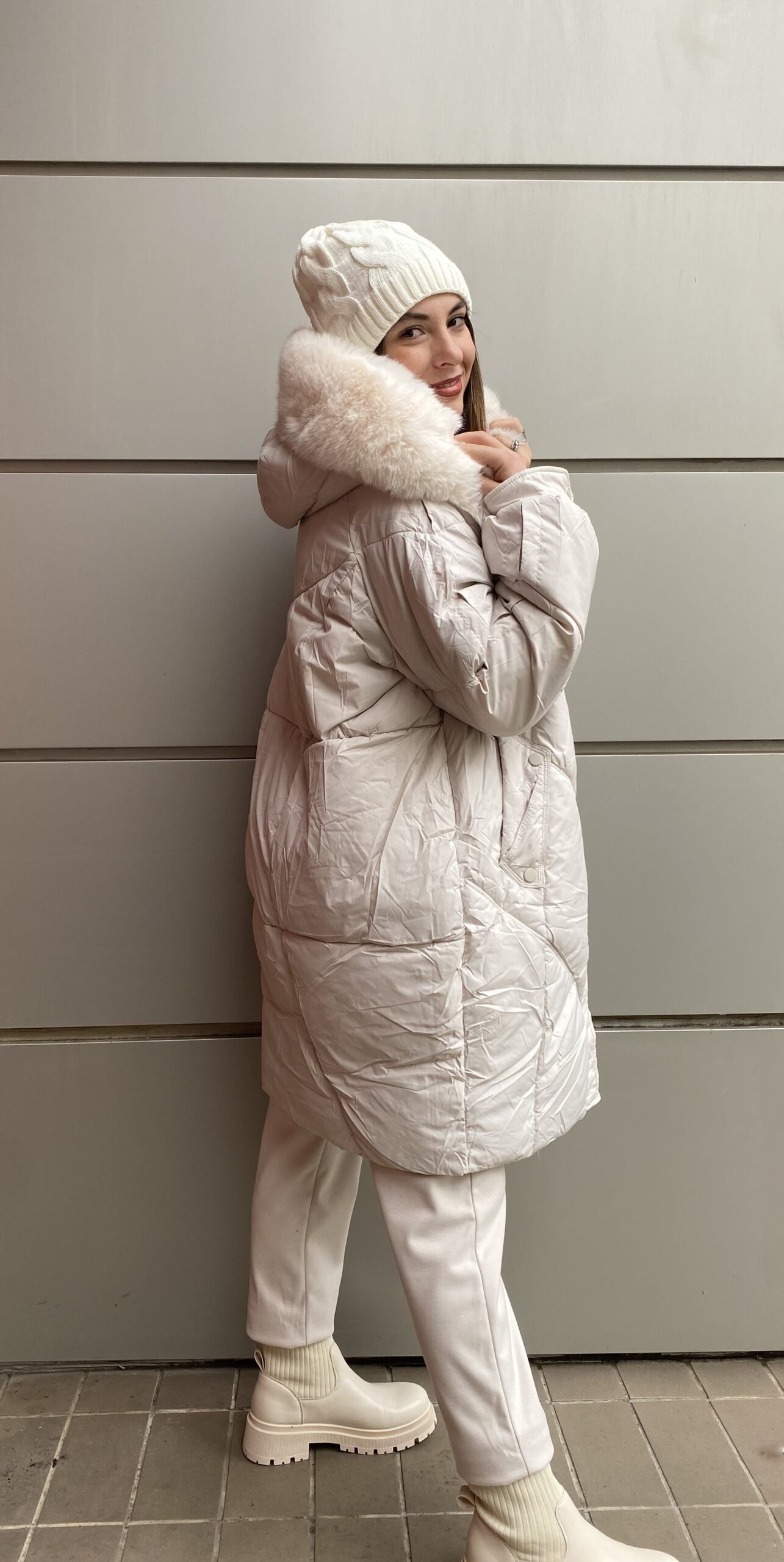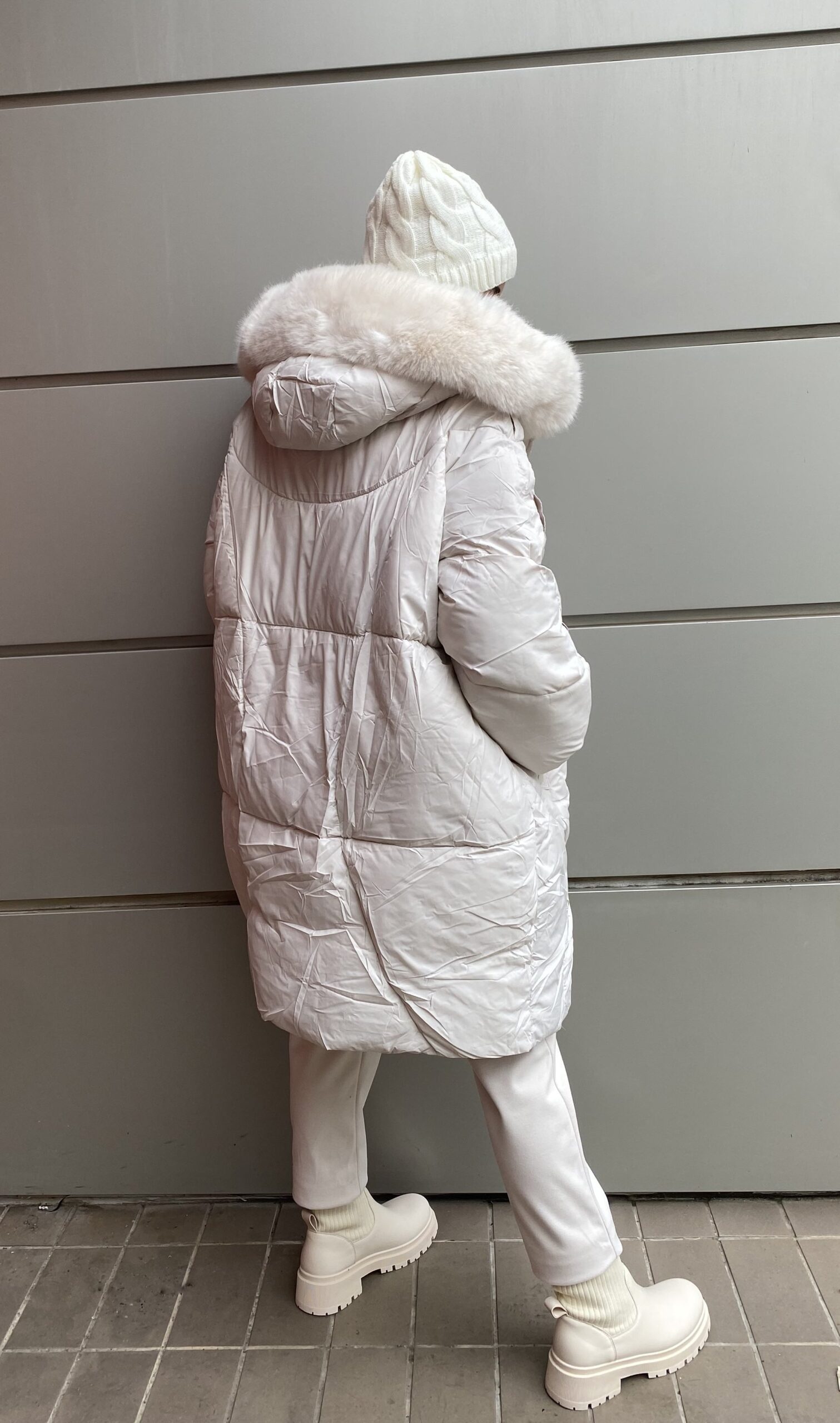 Λευκό μπουφάν με γούνα στην κουκούλα. Είναι κατασκευασμένο από ανθεκτικό ύφασμα και ζεστό για τις κρύες μέρες.