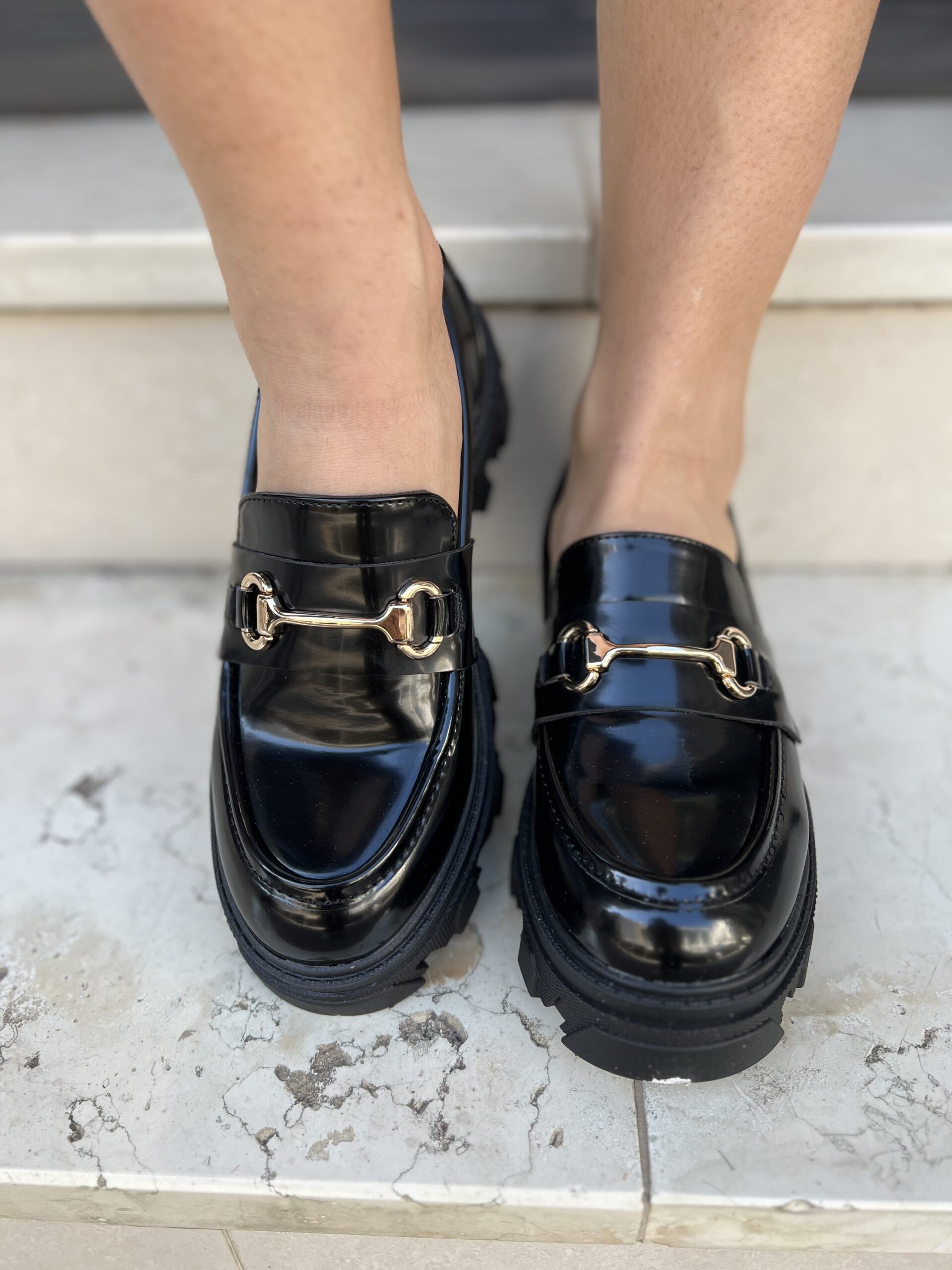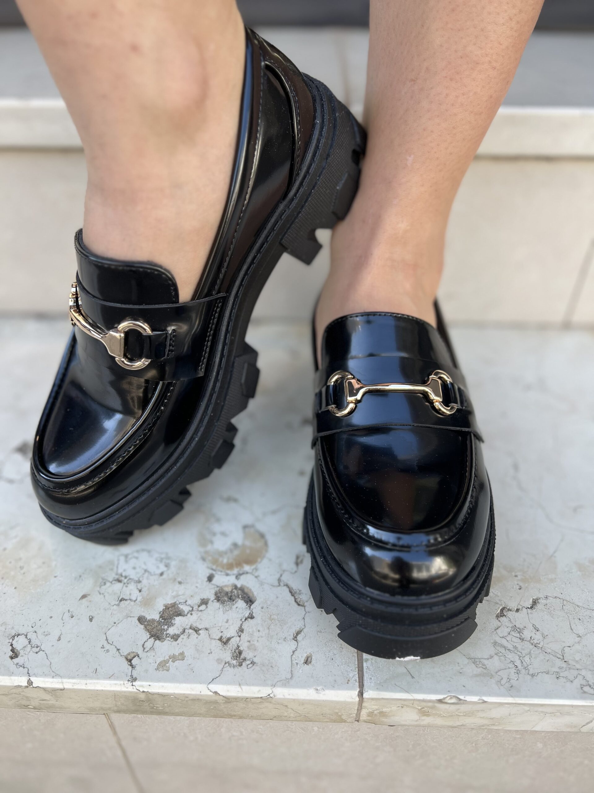 Μοκασίνια λουστρίν με τρακτερωτή σόλα. Διαθέτουν διακριτική αγκράφα στο μπροστινό τους μέρος χρυσού χρώματος.