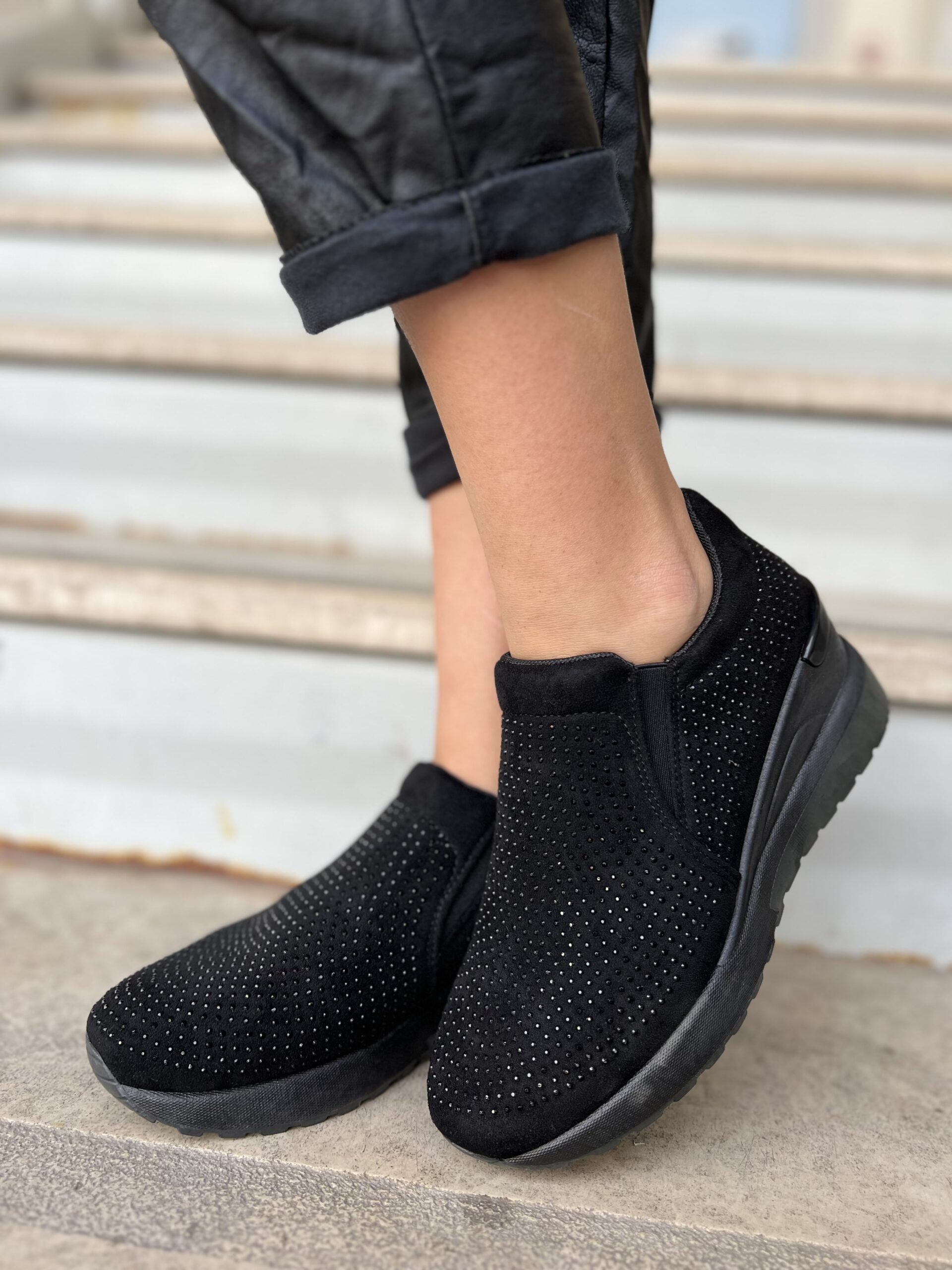 Slip on sneakers με στρας. Διαθέτουν τακούνι εσωτερικά και μεταλλική διακοσμητική λεπτομέρεια στη φτέρνα. Μπορούν να φορεθούν από το πρωί ως το βράδυ και συνδυάζονται τέλεια τόσο με παντελόνια, όσο και με φορέματα.