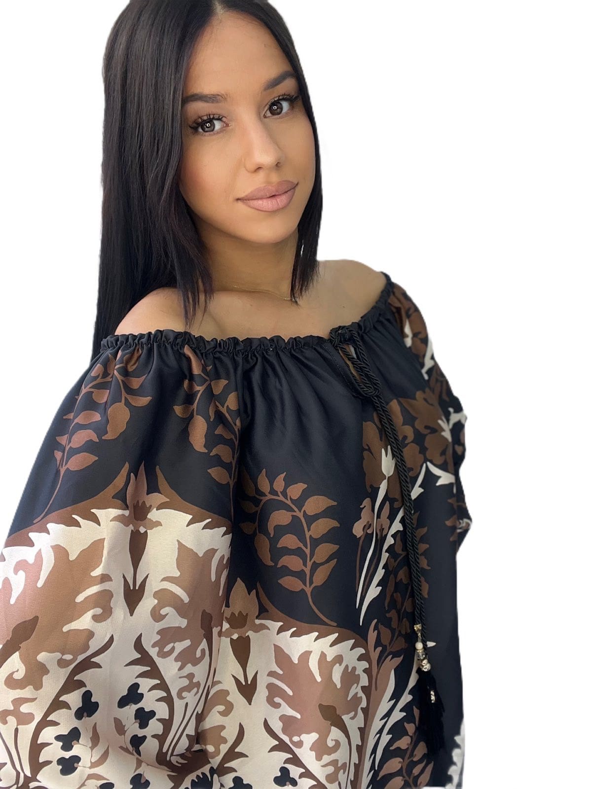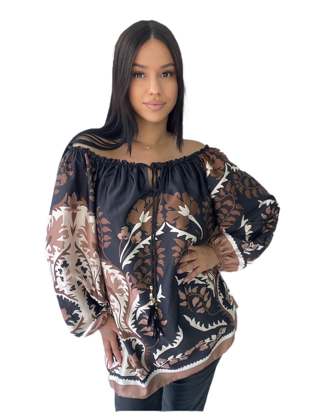 Μαύρη μπλούζα με άσπρο-καφέ λεπτομέρειες