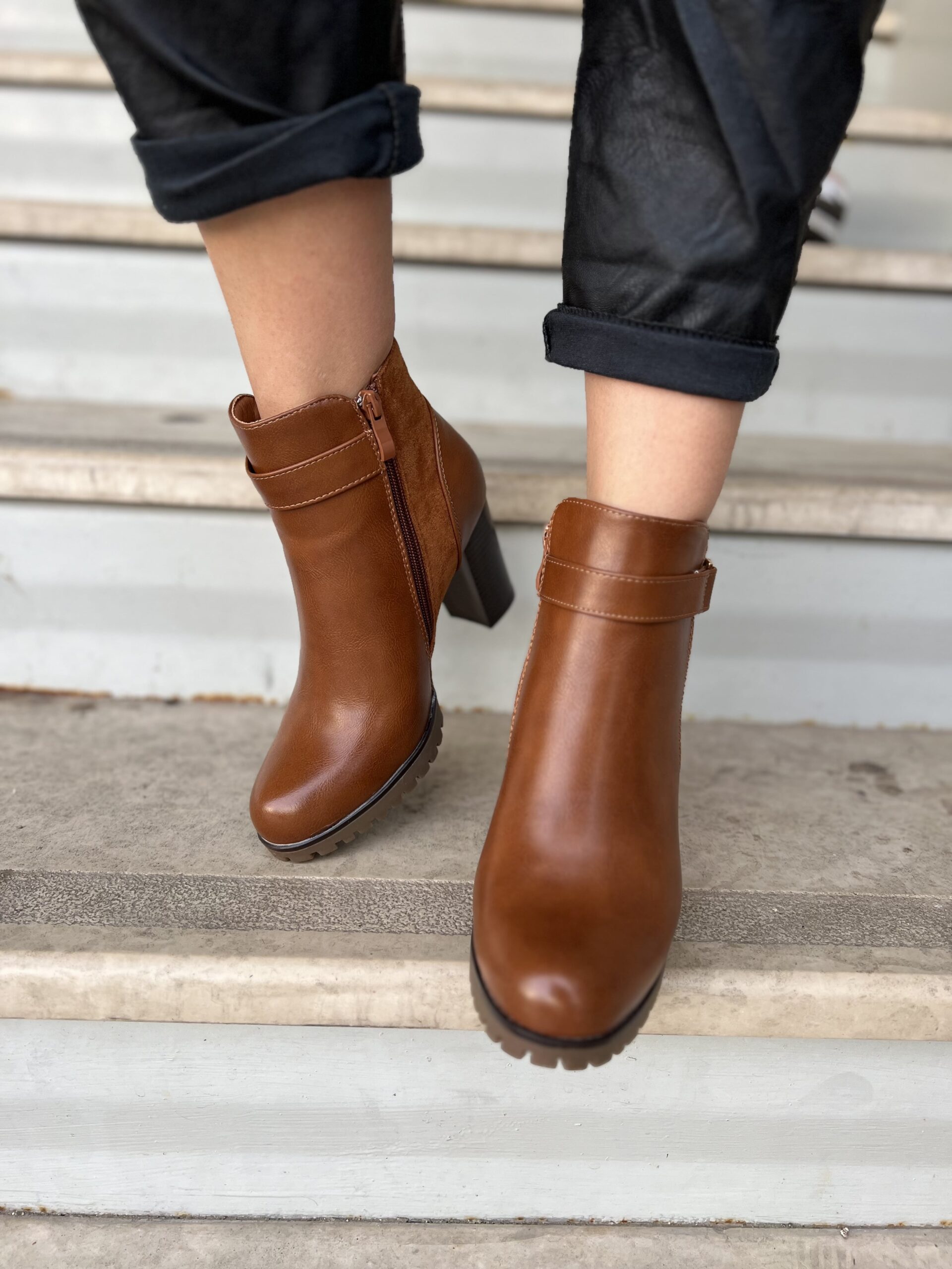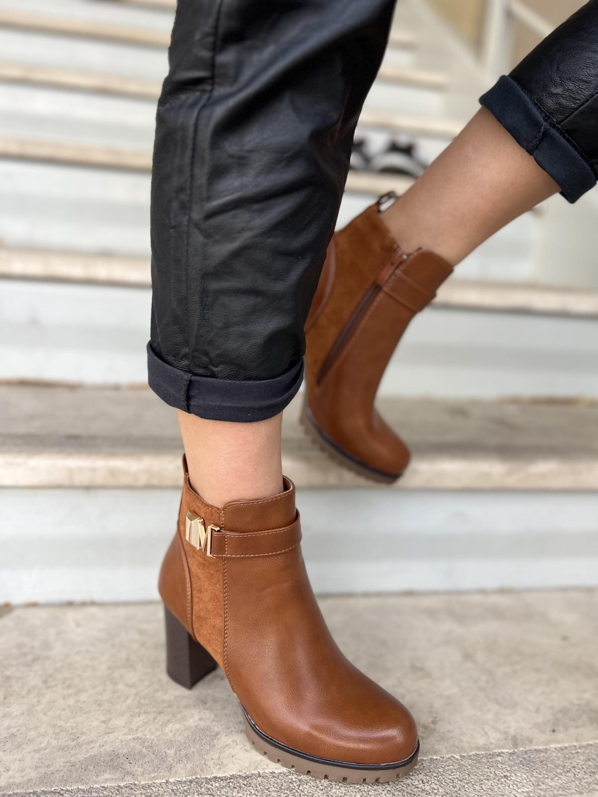 Μποτάκια δερματίνη σε καφέ χρώμα με χρυσές λεπτομέρειες. Φερμουάρ στην εσωτερική πλευρά και λάστιχο. Μεσαίο χοντρό τακούνι.