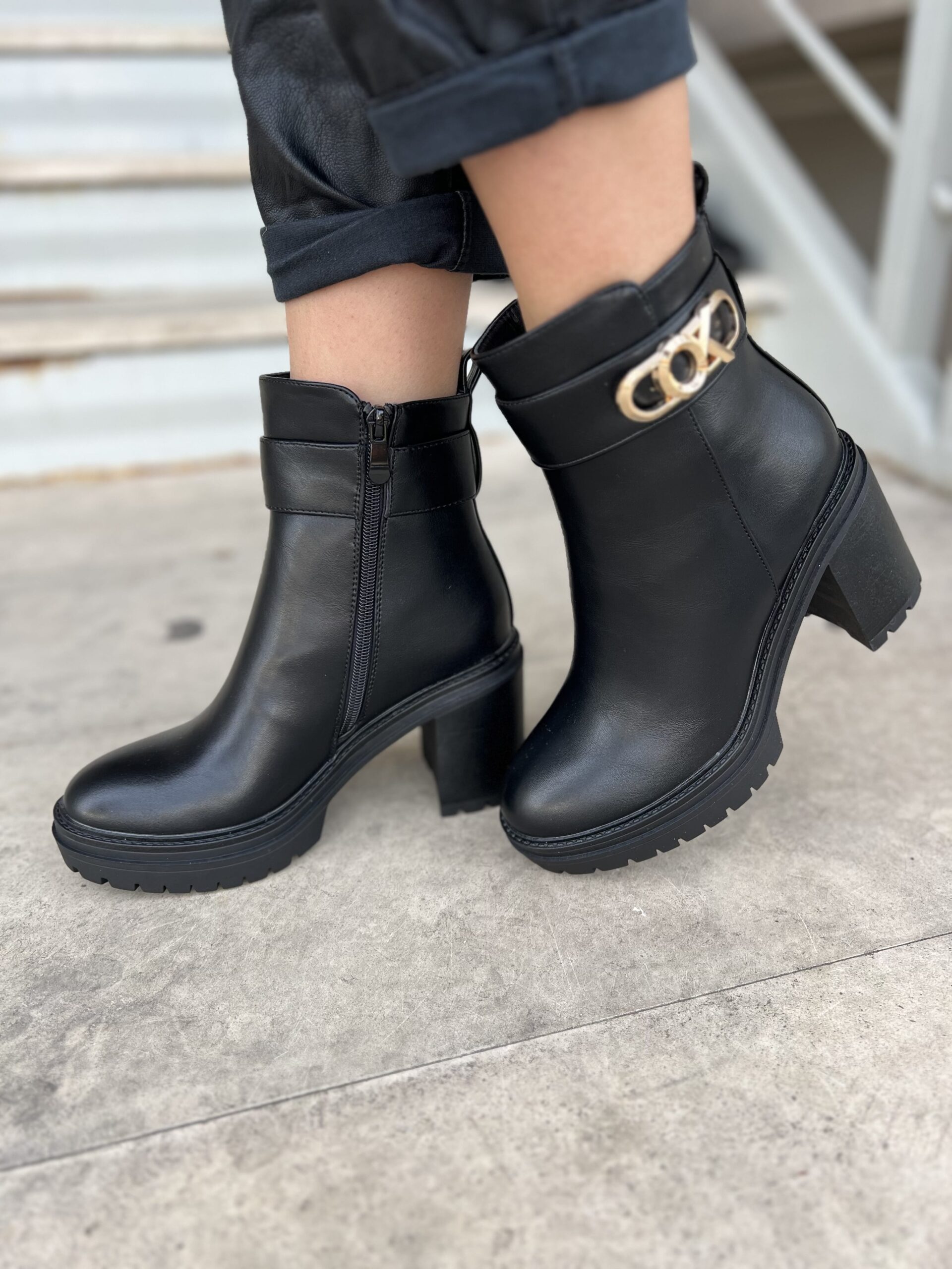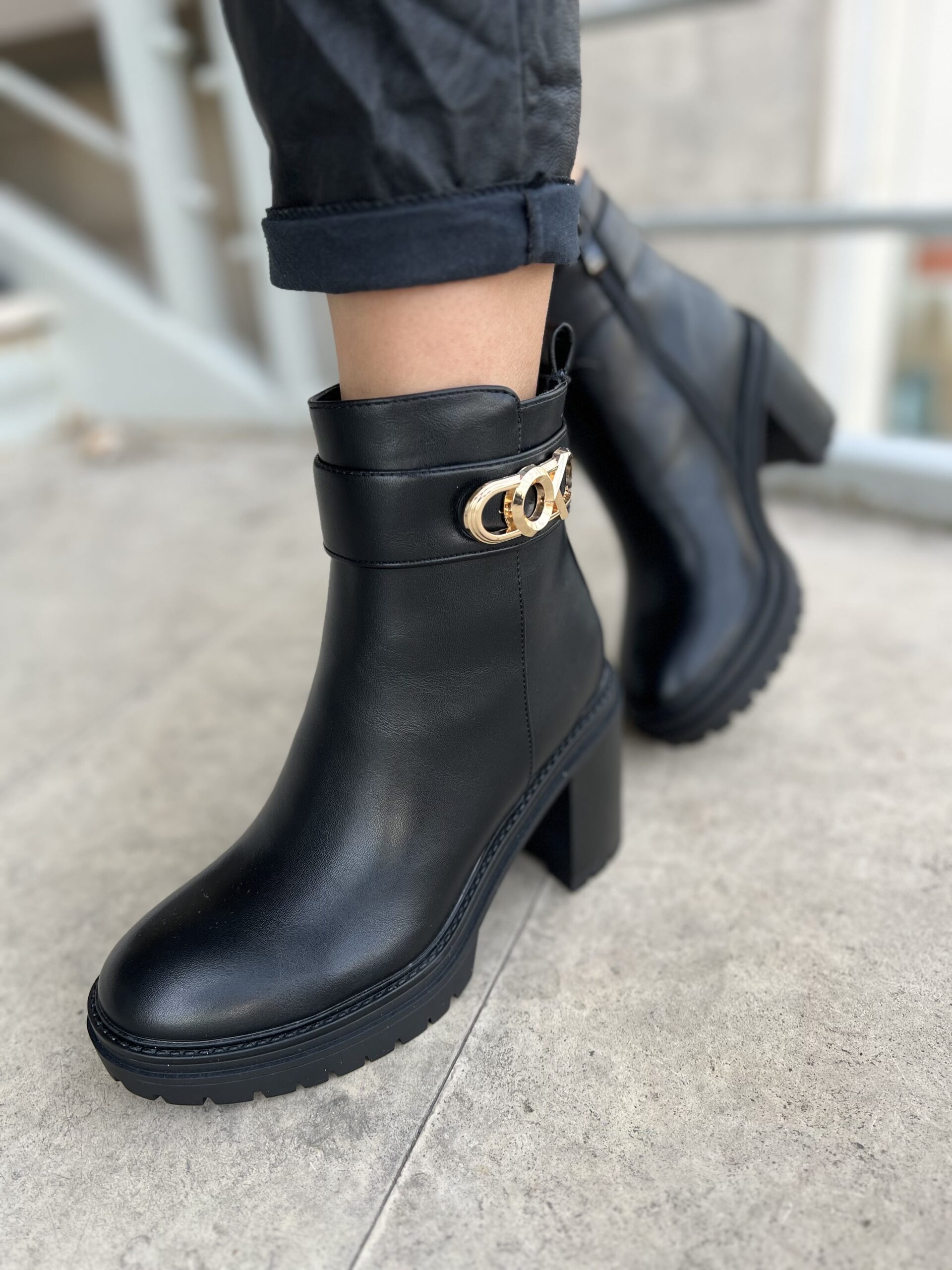 Μποτάκια δερματίνη σε μαύρο χρώμα. Διακοσμητικό λουράκι και χρυσές λεπτομέρειες. Φερμουάρ στην εσωτερική πλευρά. Μεσαίο χοντρό τακούνι
