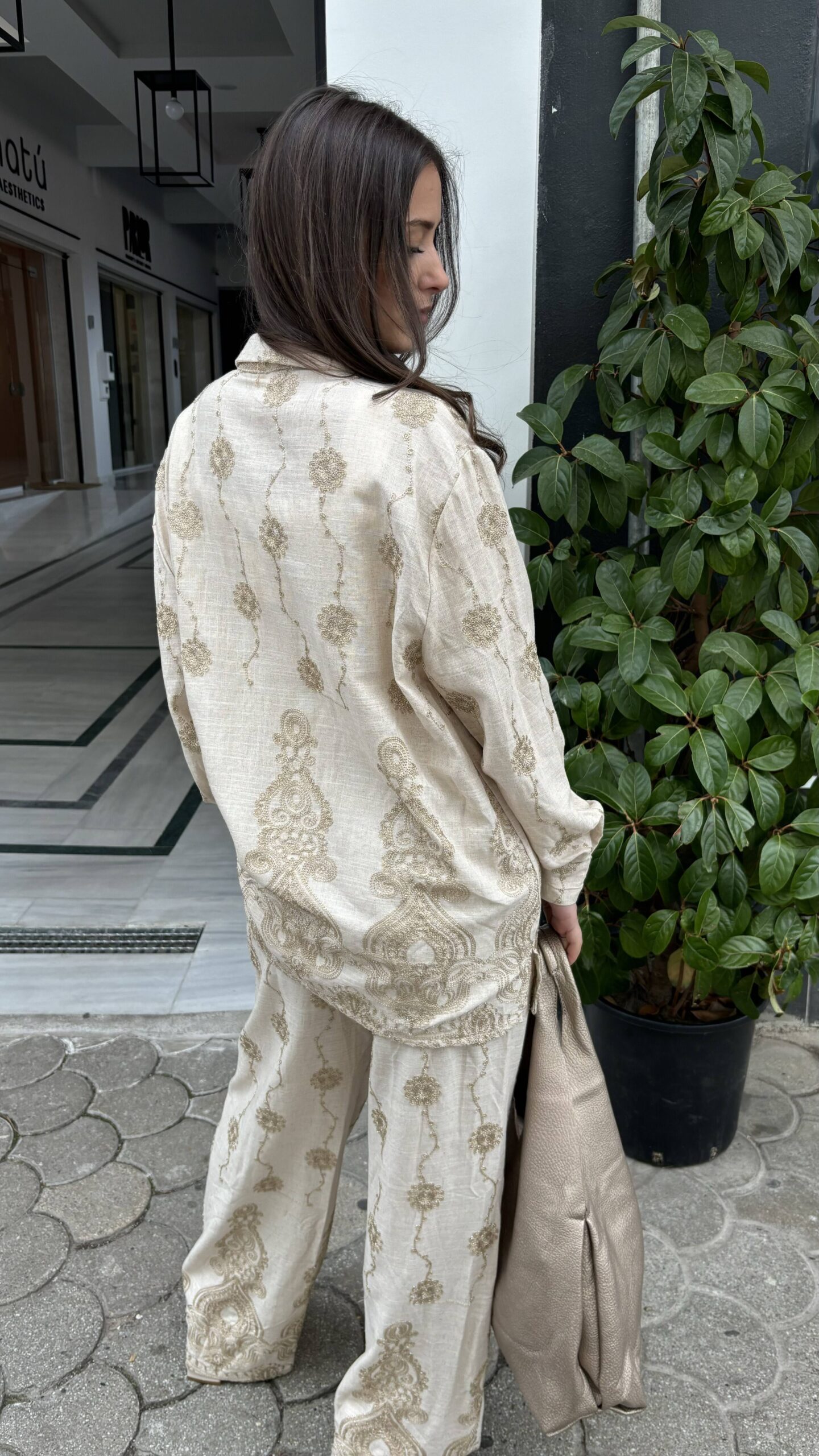 Σετ πουκάμισο και παντελόνι μπεζ με κεντημένα σχέδια