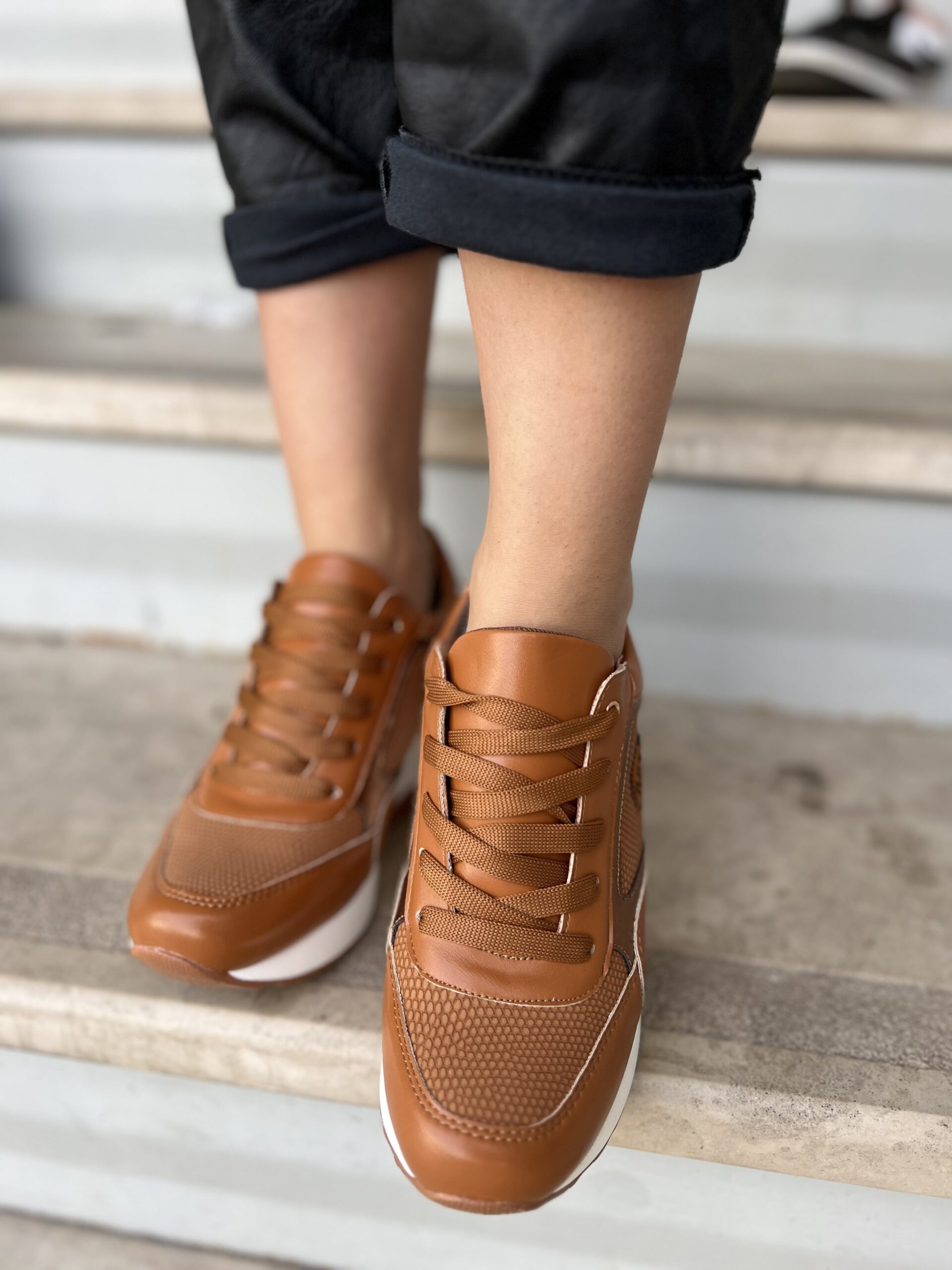 Αθλητικά δερματίνη σε καφέ χρώμα. Δίπατα με χρυσή λεπτομέρεια στο πίσω μέρος. Δετά με κορδόνια.